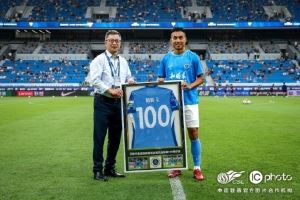 赛前,王峤领取深圳新鹏城生涯联赛百场里程碑纪念球衣