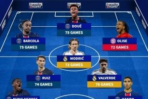 体育资讯7月21日讯 德国转会市场统计了球员上赛季的出场次数,并列出了出场最多阵容,巴尔韦德、莫德里奇、阿什拉夫在列,巴黎5名球员入选。
