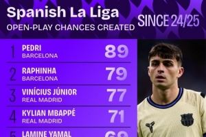 体育资讯10月16日讯 日前,Squawka统计了西甲运动战创造机会次数排行,佩德里、拉菲尼亚前二,维尼修斯第三。