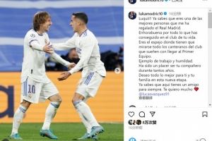 莫德里奇社媒晒出与巴斯克斯的合照,并写道:“卢基!你知道的,你是我在皇马遇到的最好的人之一。”